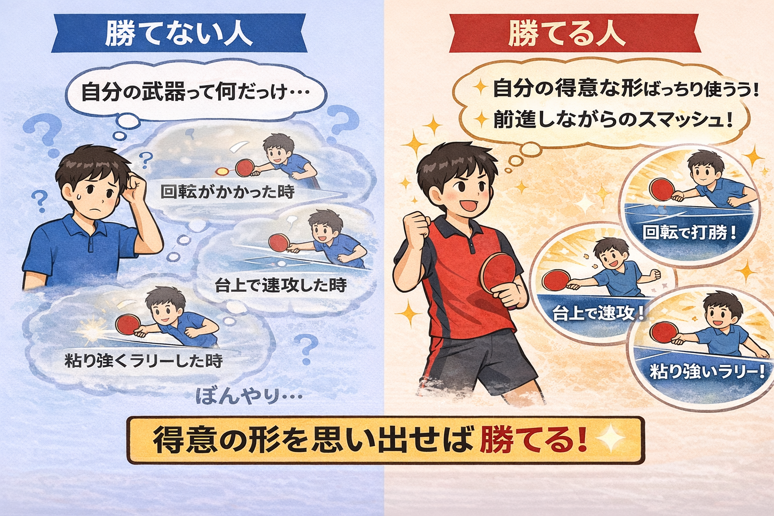 卓球は、得意分野の組み合わせで勝敗が決まる競技です。