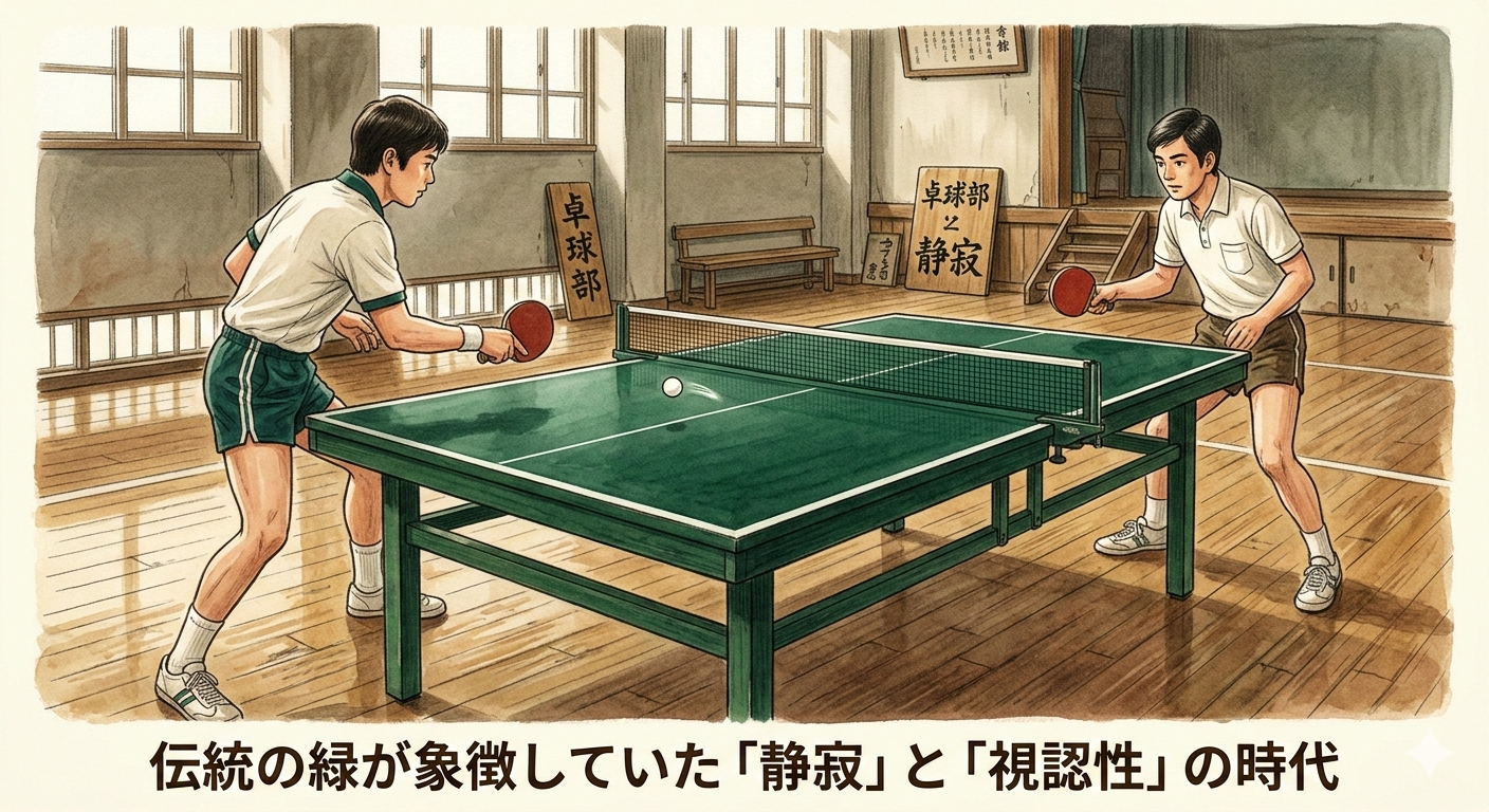 当時のボールは、燃えやすい性質を持つものの打球感に優れたセルロイド製の白球。深い緑色を背景にすると、白い球の軌道が最もくっきりと浮かび上がり、選手の目にも負担が少なかったのです。学校の黒板が緑色であるのと同じ論理で、長時間小さな球を追い続ける卓球において、緑は機能的な正解でした。しかし、この「落ち着いた緑」こそが、後に卓球が抱えることになる最大の課題——地味で暗いイメージ——の象徴となってしまいます。